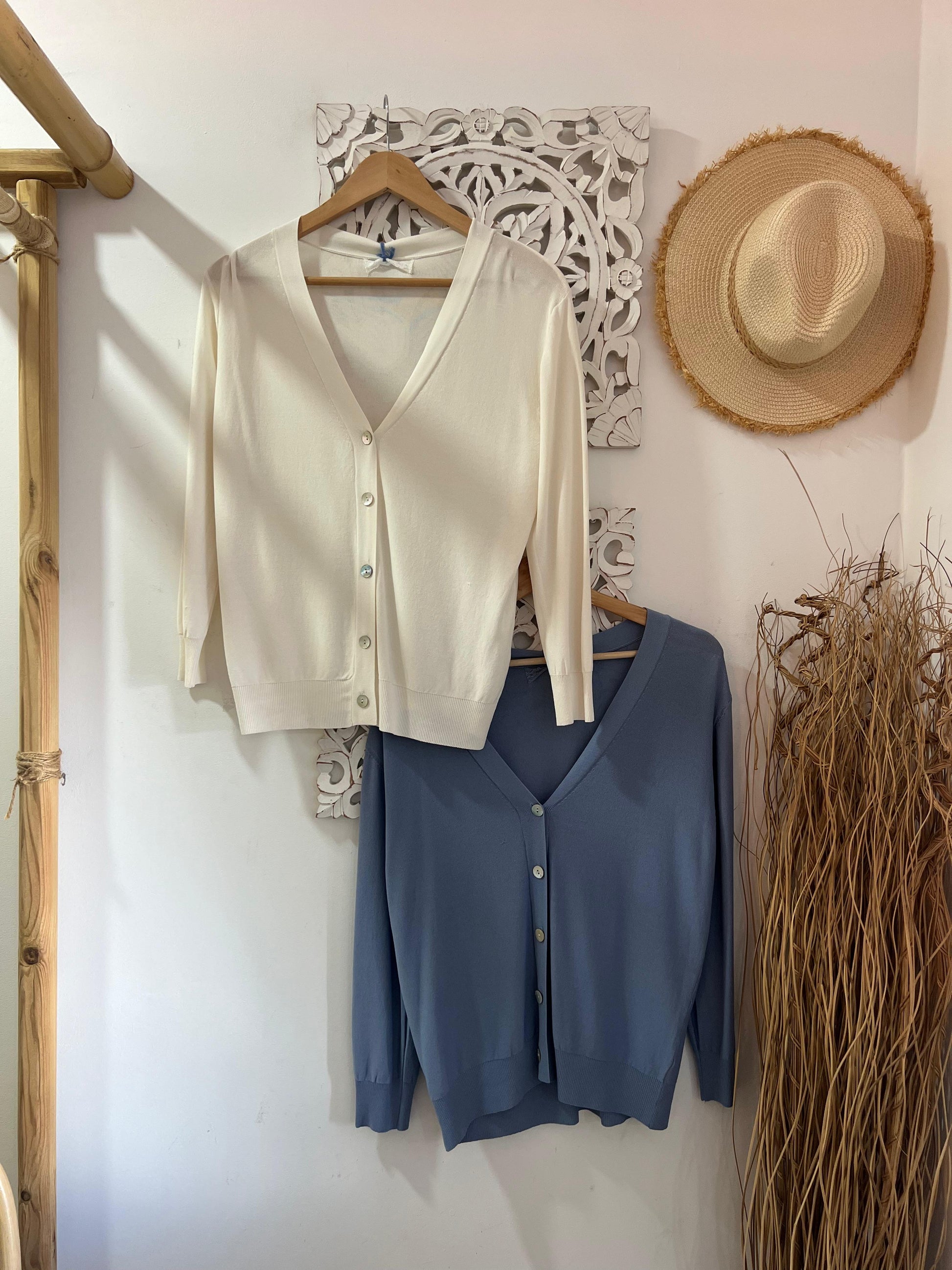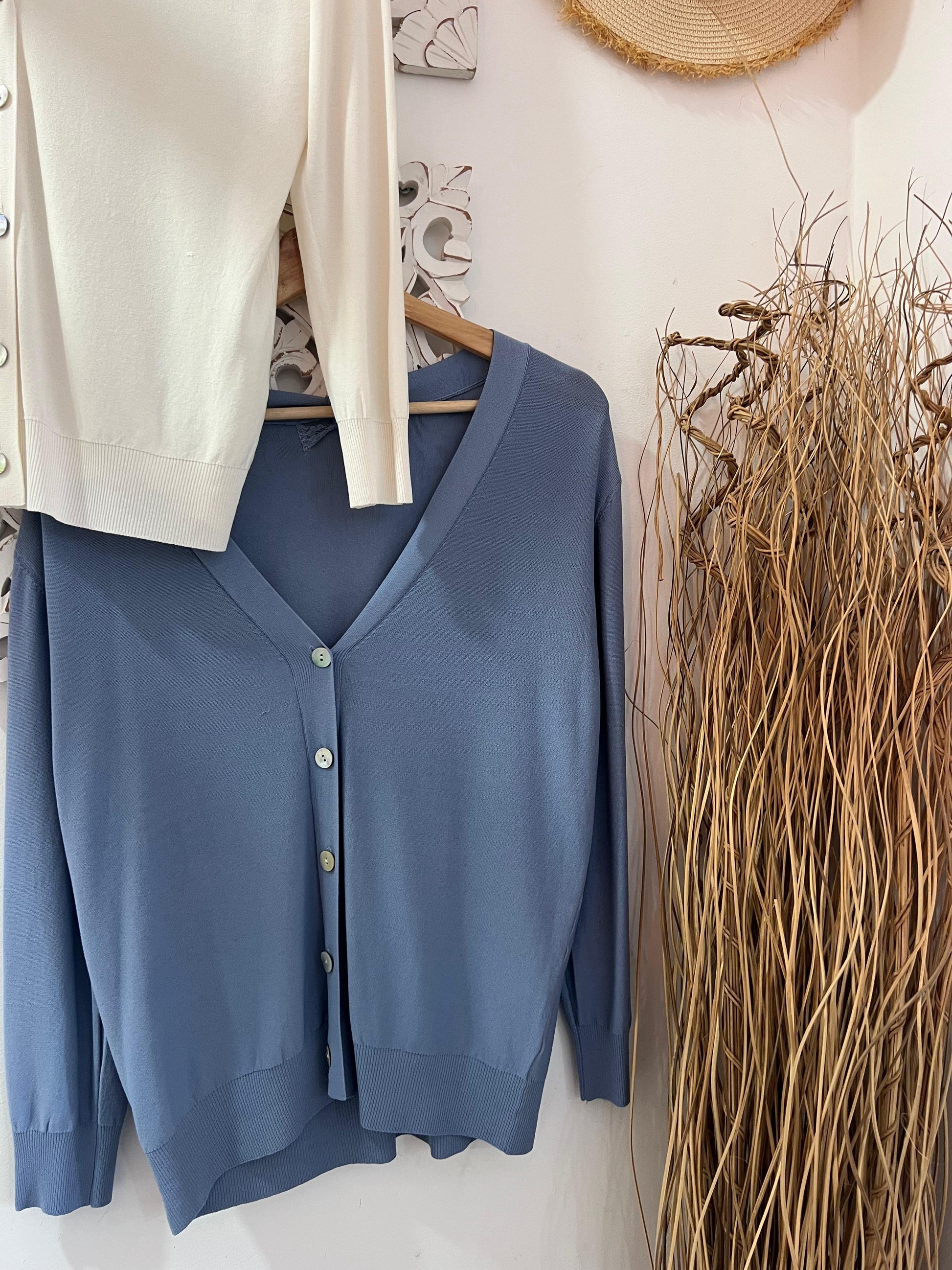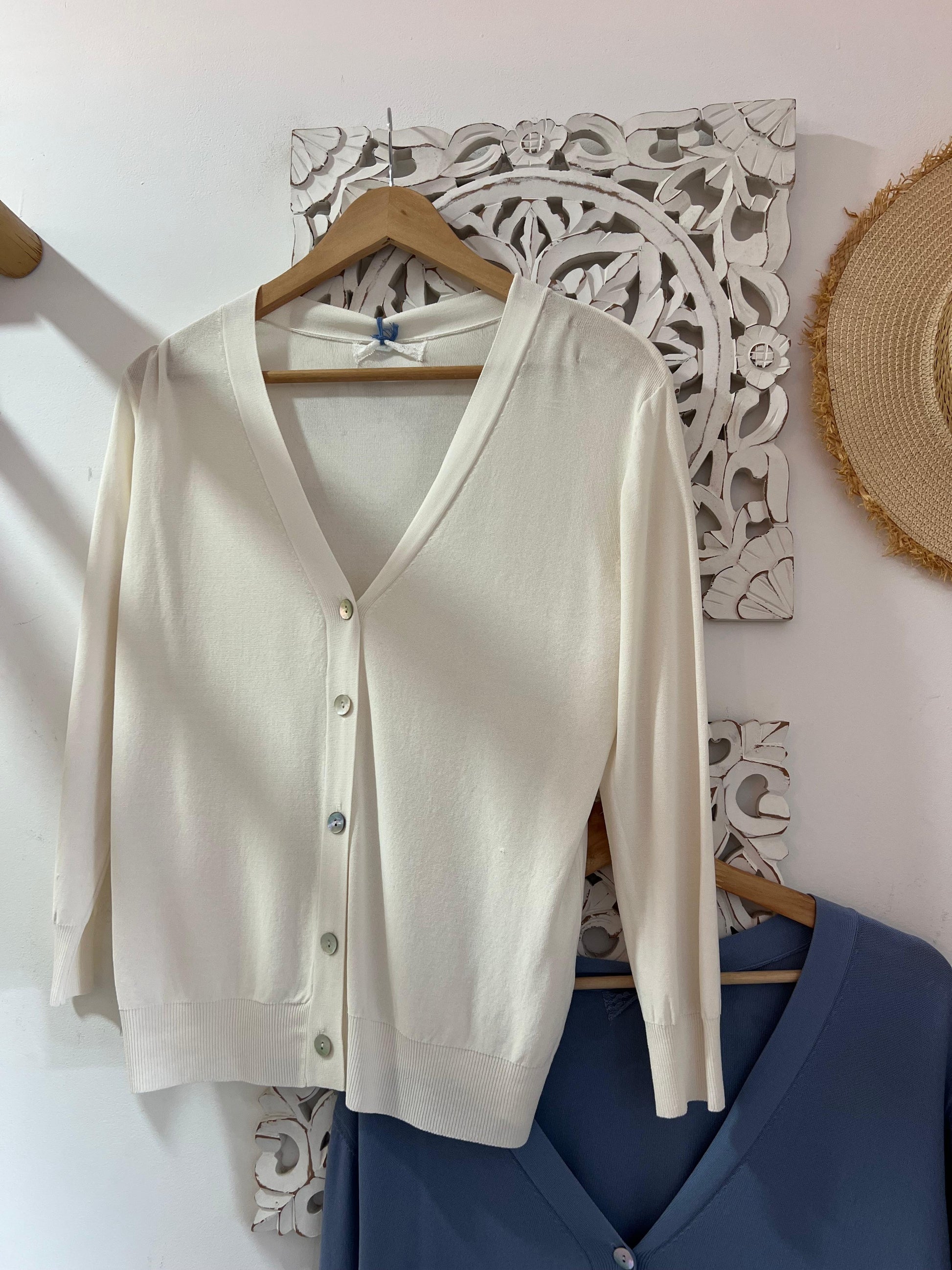 Casaco malha fininha decote em v, fecha com botões Tamanho único
