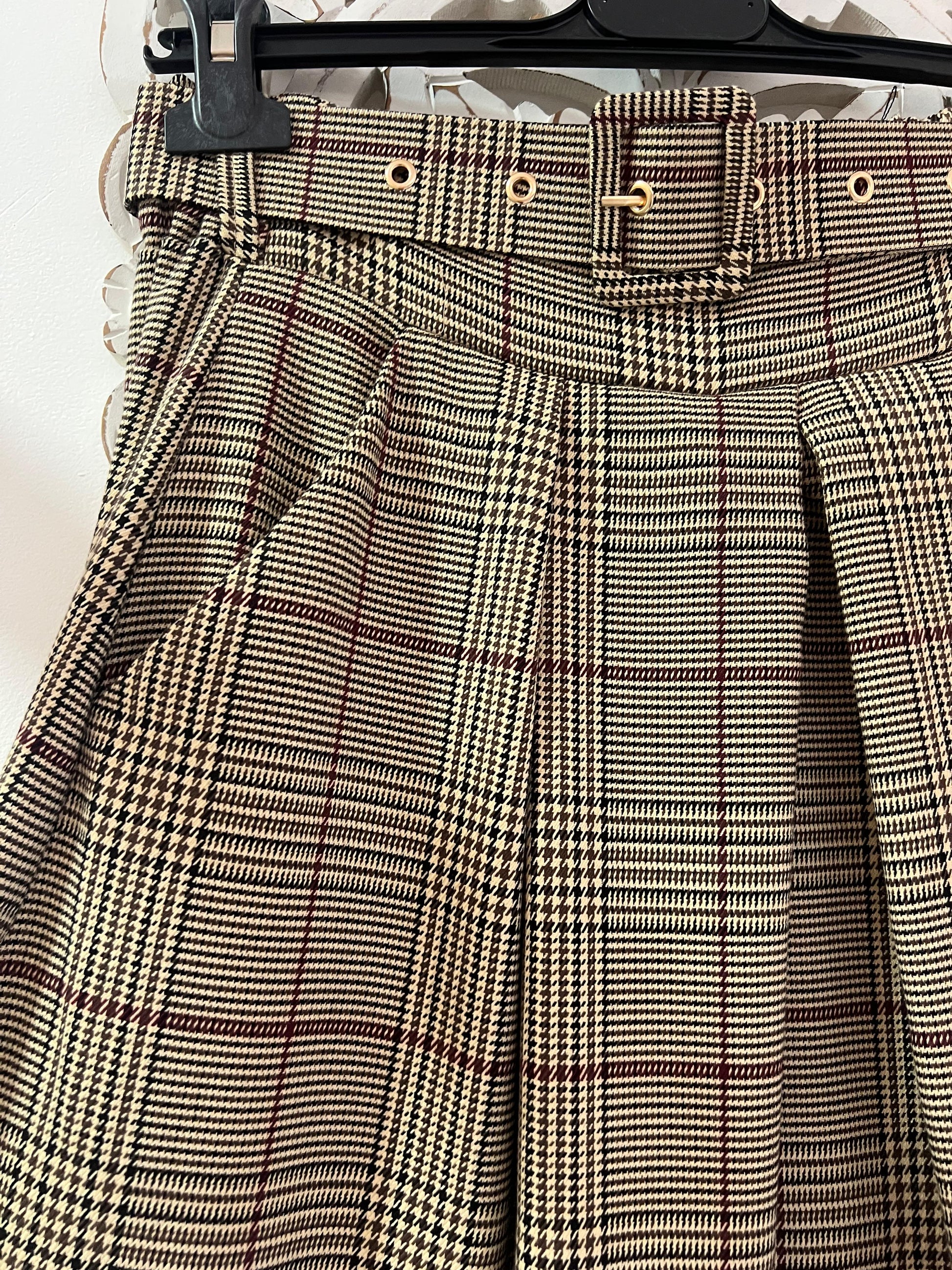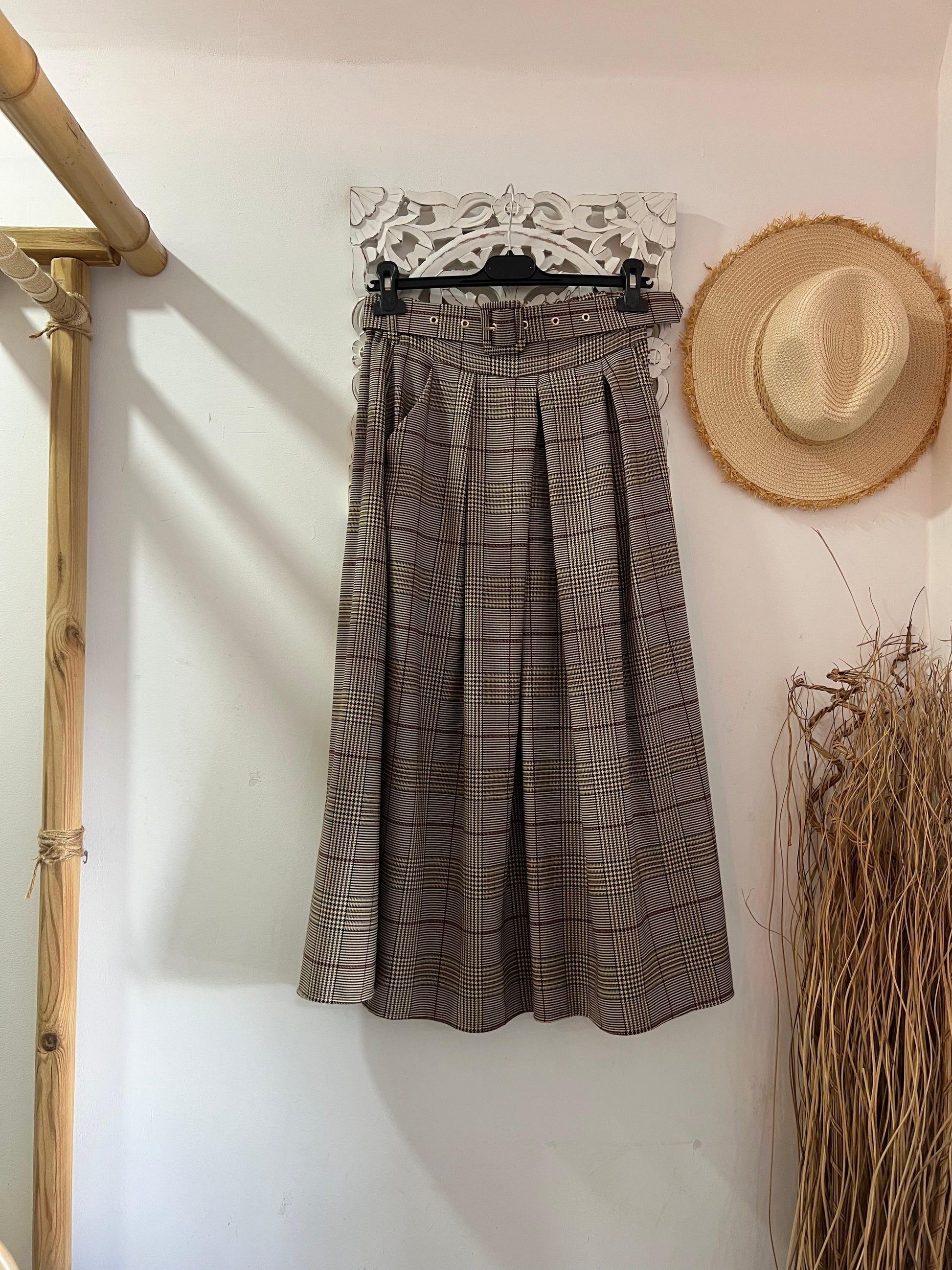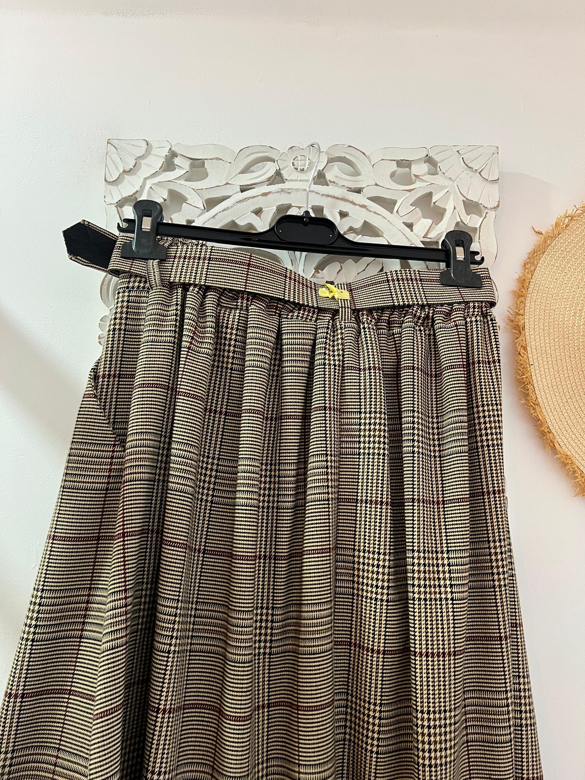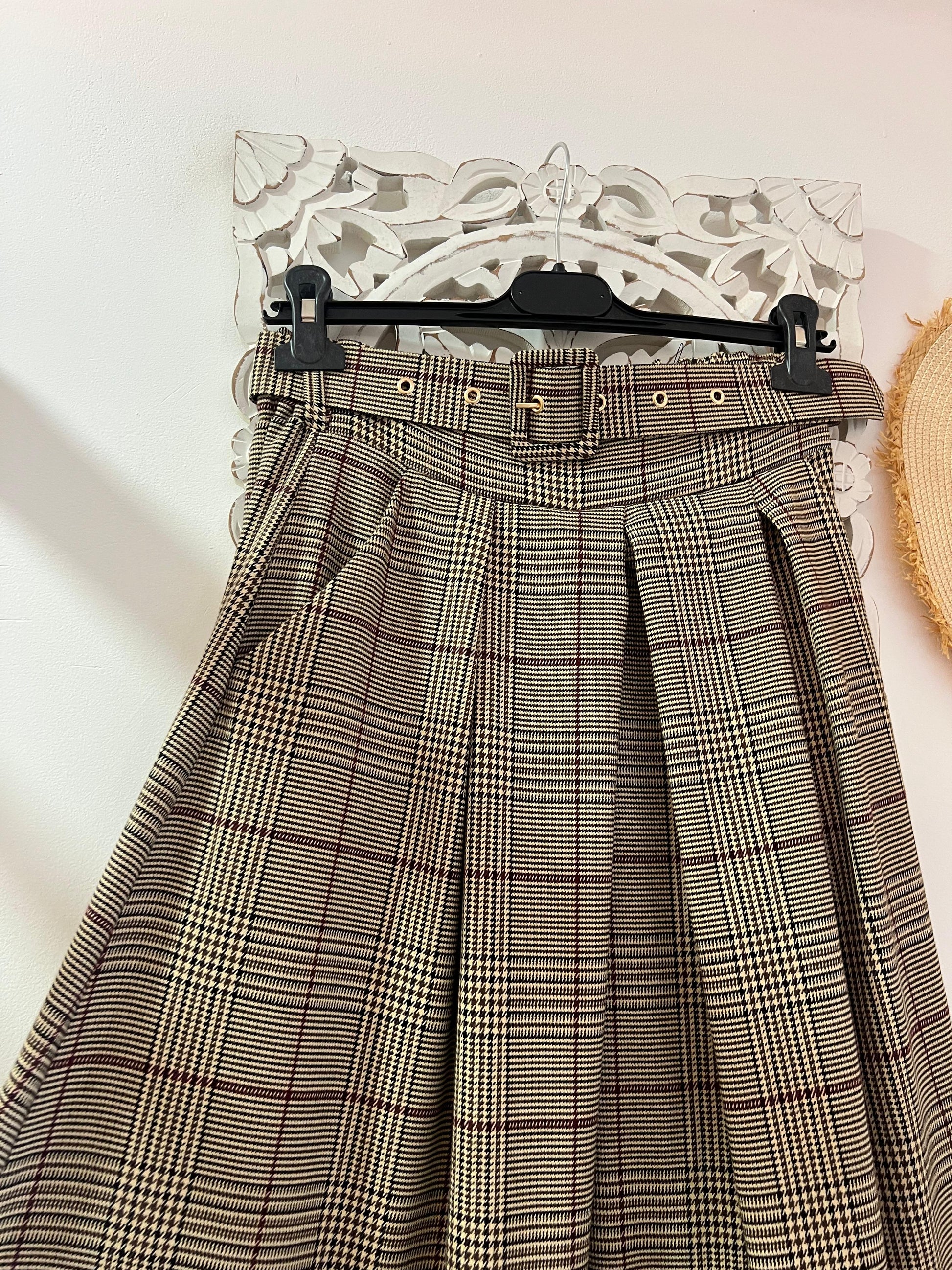 Saia xadrez com bolsos e cinto do mesmo tecido